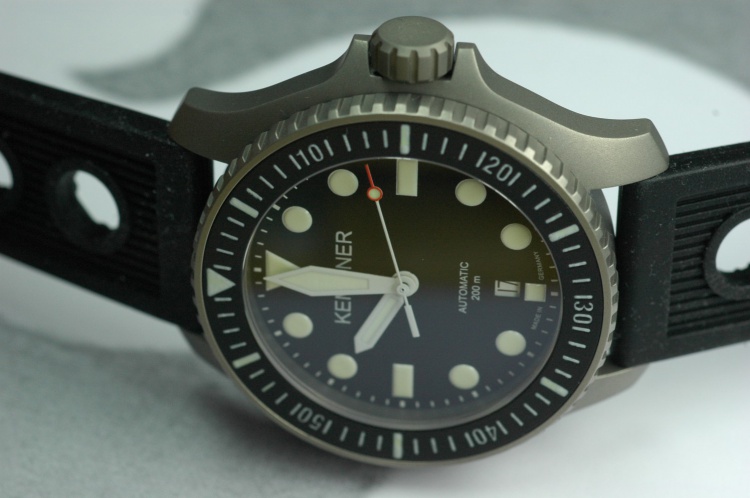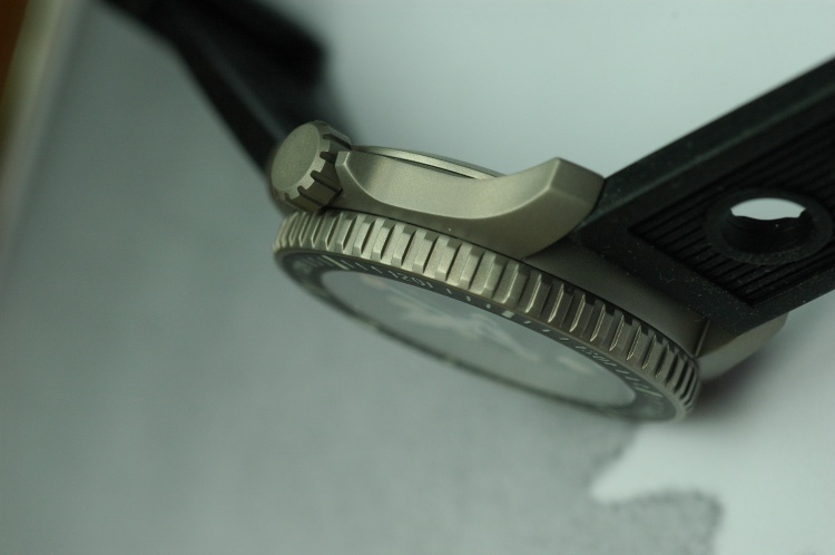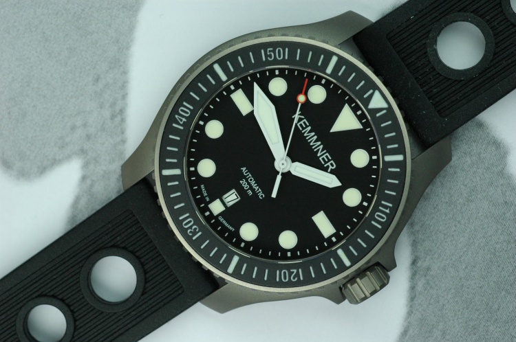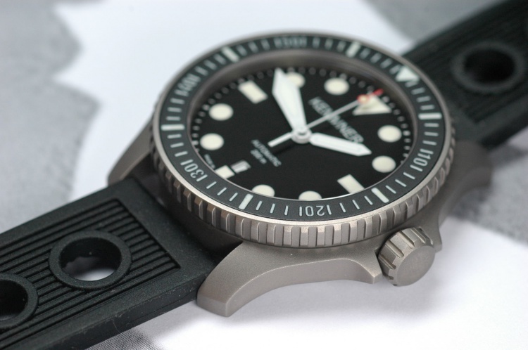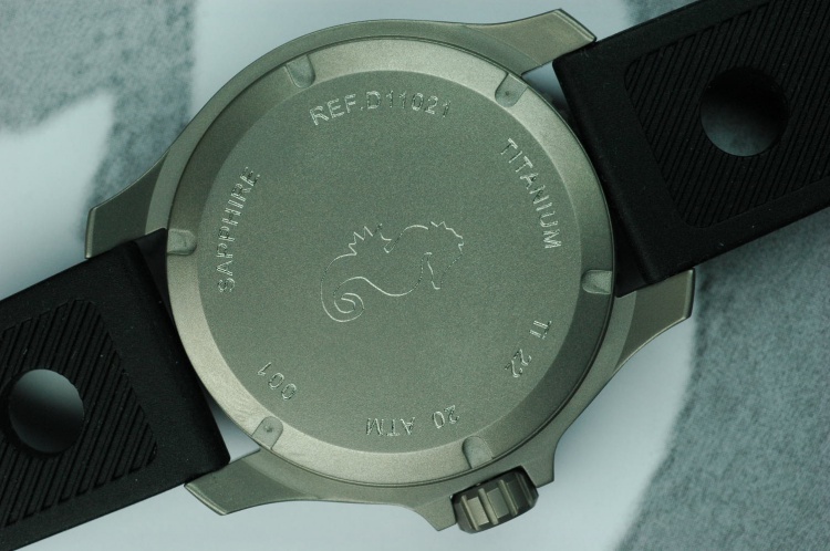 the titanium diver’s watch „SEAHORSE“ Ref. D11021 is available now. The finish is beadblasted matte. The case diameter from 6 to 12 is 41 mm and from 4 to 10 =44 mm, the bezel diameter is 42,2 mm und the height = 11,8 mm. The total length over the lugs is 50,2 mm and the space between the lugs is 22 mm. The bezel is turnable only lefthandside with 60 clicks. The diameter of the screw-down titanium crown is 8 mm. The „SEAHORSE“ has a diameter 31,6 x thicknes 2,25 mm sapphire-glass inside antireflect and is waterresistant 20 ATM = 200 m. The screwed case-back is engraved and has a jumping number. The alu-insert has all 60 minute marks and a light storage capacity. The total weight including the strap is 87 g.