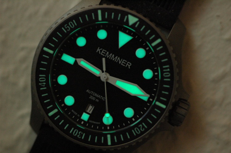 The black matte dial has thick printed Superluminova C1 white numerals. The white framed hands are filled with SL C1 white. The date over six makes the 6 hours line longer.