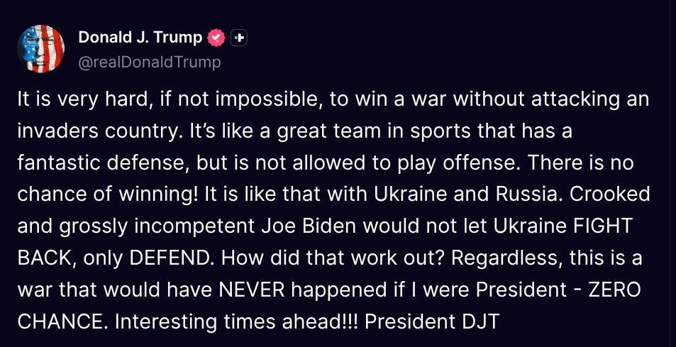 Ja ar mūsu politiķiem viss skaidrs, pašreiz tiek domāts maximāli par savu drošību, tad rietumi ir mistika. Varētu nostāties Trumpa pusē un piespiest Zelenski kapitulēt. Mēs iztiekam bez Abrenes, Somi bez Karēlijas, Ukraiņi bez Krimas, Donbasa un iespējams Luhanskas. Gan jau varētu moš vienoties par kaut kādu 30 km ne militāro zonu, kur neviena.karavīra nav. Bet tomēr rietumu politiķi turpina solīt, ka viss vēl iespējams tajā pat laikā bruņojuma ziņā ukraiņiem pamet tikai kapeikas. Jā taisnība, ka sarunas izbeidz karus, bet ieroči tos uzvar. Nevis sankcijas, nosodījumi, tiesas vai citas huiņas. Tikai un vienīgi ieroči.