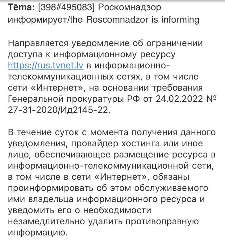"Roskomnadzor" medijam http://rus.tvnet.lv atsūtījis "pavēsti", kurā aicina 24 stundu laikā izņemt "kaitniecisko" informāciju, citādi vietnes pieeja Krievijā tiks slēgta.