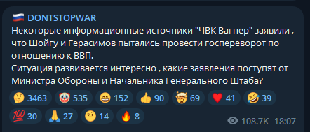 Jā, tikai ir viena lieta, ka līdzi Prigožnijam ieņemt Maskavu vilkās arī daļa smagā artilērija un par cik Maskavu ieņemt tā kā plāni pamainījās, tad pastāv moments, ka tā tehnika ir tagad ceļā kaut kur uz Baltkrieviju un tur no robežas līdz Kijevai ir 100km ... attiecīgi Prigožniju pie tāda scenārija bija jātaisa uz kādu momentu par baltkrievu ... nu kamēr visi haipo ap kaut ko citu ... bet nu šīs visas spekulācijas, jo pēc vakardienas notikumiem hvz kas te vispār notiek ...