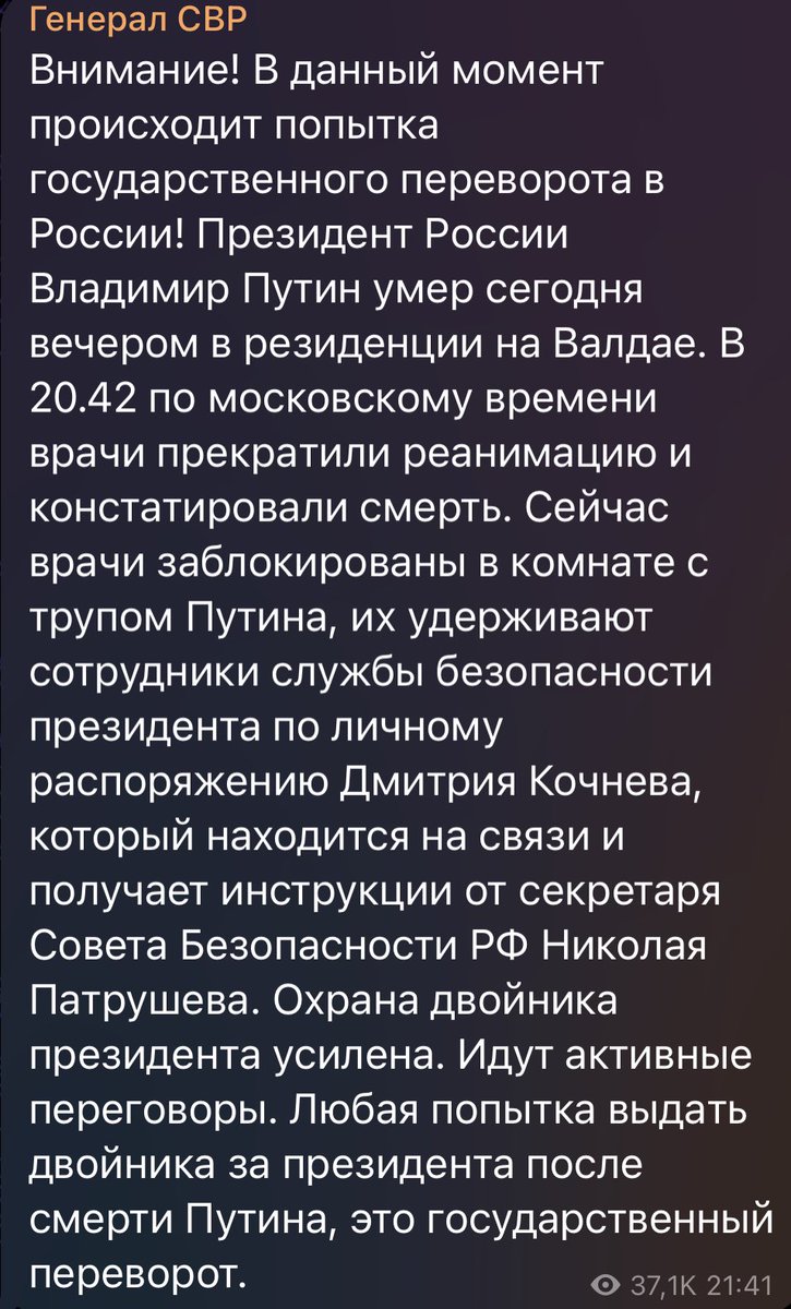 После этого вам расскажут, что окружение Путина разделилось по вопросу, использовать ли его двойника в качестве президента, или всё же объявить о смерти Путина. Будут подробности о том, кто к какому лагерю примкнул. Условно, вокруг Патрушева сгруппируются те, кто за двойника, а вокруг Мишустина - те, кто против. Возможно, вам даже расскажут (конечно, с подробностями), что двойника попытались физически ликвидировать, но его спасли.