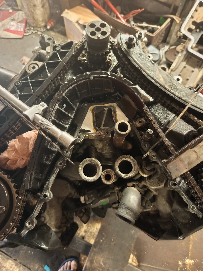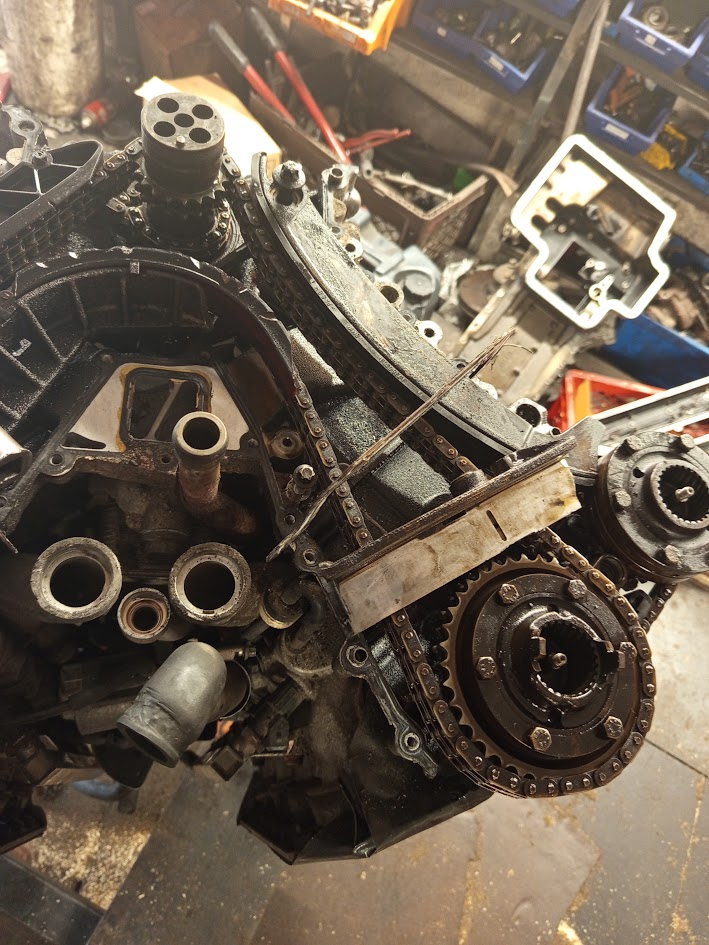| Viss sākās pagājušogad ar nelielu graboņu motorā, kas pamazām kļuva skaļāka. Noliku auto mierā uz ziemu un uz kādu laiku atstāju manu monstru garāžā, līdz pienāca brīdis, kad izdomāju tomēr ir jāsaprot, kas ir par vainu un izjaucām motoru. Pirmā doma bija protams lielā eļļas ķēde izstiepusies vai spriegotāji, mierinātāji utt, taču izjaucot motoru atklājās, kas cits. Cik saprotu pagājušo reizi nostiprinot deflecation rail (113114063660) un skrūvējot fiksācijas skrūves - tās laikam netika uzsēdinātas uz līmes, kā rezultātā atnāca vaļā skrūve, un deflectaion rail sāka kustēties, līdz sadalījās gabalos. Paveicās, ka viens gabals nokrita karterī, bet divi pārējie palika fiksēti. Labi, ka ķēde nepārleca vai neuzkāpa uz zobratiem :-). Labi, tas tā... tāds mazs priekšvārds.