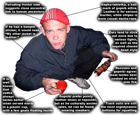 Krievijā mītošie ārzemju laikrakstu korespondenti ir gājuši vēl tālāk un savā sienasavīzē detalizēti analizē gopņiku fenomenu no ārzemnieku skatpunkta. Viņi arī ir noķēruši vienu eksemplāru un ir gatavi aprakstīt to no visām pusēm.